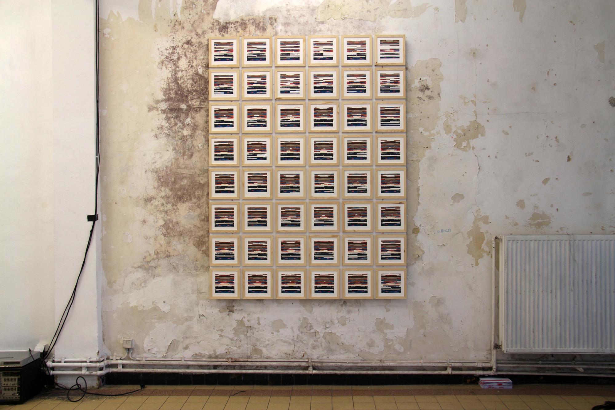 The abstract composition is connected to reality through the voice-over. Based on an ambi-guous oral description, the spectator has to create his own subjective meaning. Laurent Trezegnies creates the sculptural installation in response to the exhibition space and audiovisual works. It is a sculptural materialisation of the concept, at the same time more con-crete and ephemeral then it‘s audiovisual form.