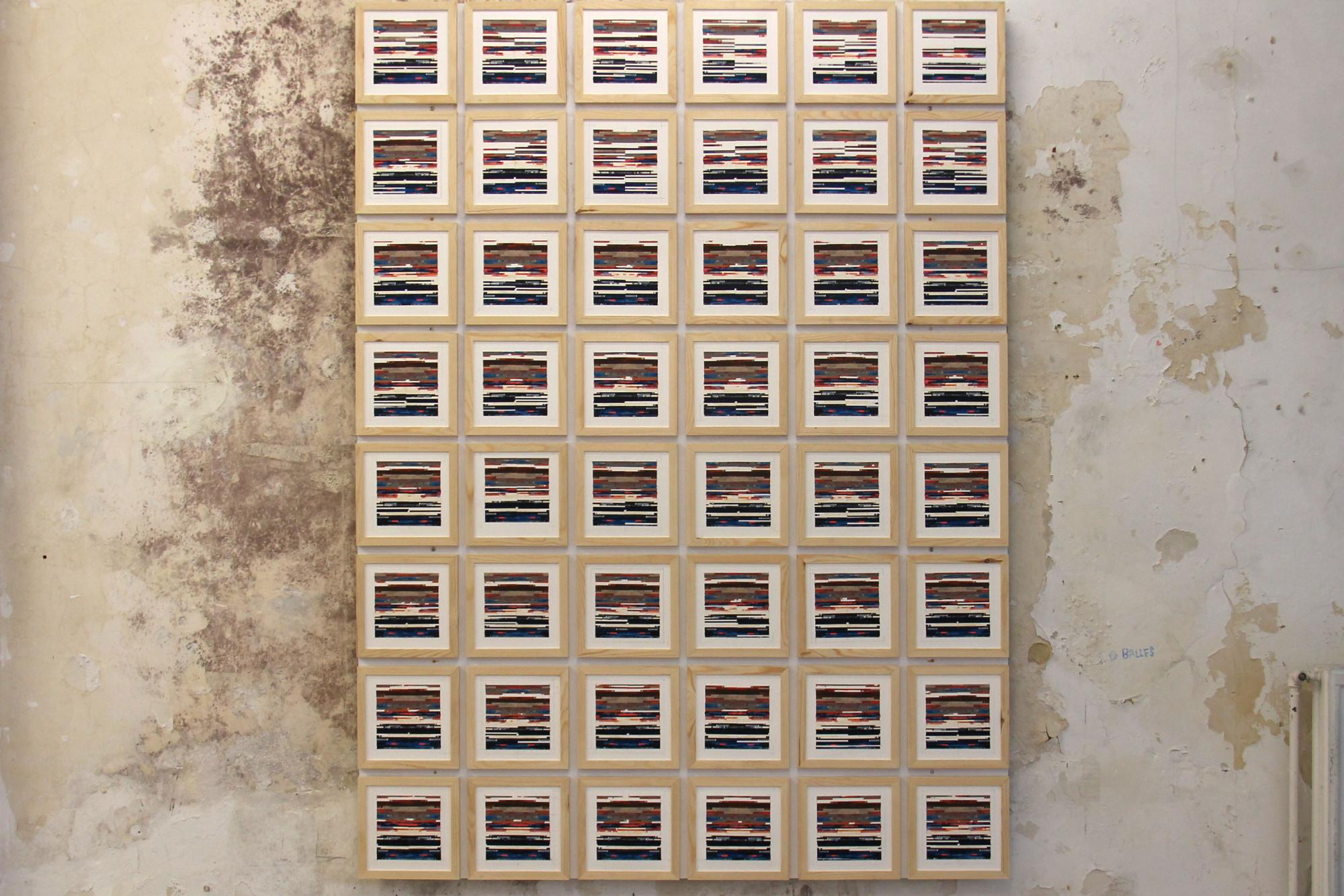 Acrylic, collage, paper, wood frames